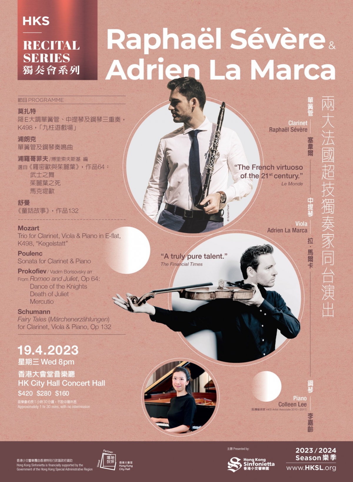 一位是如日中天的單簧管明星,另一位是首屈一指的中提琴萬人迷,兩位法國超技獨奏家塞韋爾和拉.馬爾卡一拍即合,一起現身香港大會堂同台獻技,並夥拍香港星級鋼琴家李嘉齡,為樂迷精彩演奏多首室樂作品,當中包括莫扎特的「九柱遊戲場」三重奏,盡顯作曲家的精妙佈局;拉.馬爾卡亦會演繹來自浦羅哥菲夫《羅密歐與茱麗葉》的選段,絲絲琴弦如泣如訴,觸動心靈。