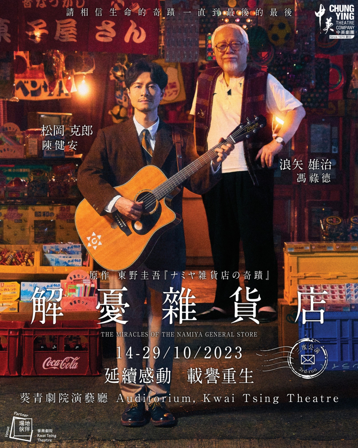 改編自日本作家東野圭吾同名小說《解憂雜貨店》,中英劇團曾於2018年及2022年在港演出粵語版,全院滿座,2023年載譽歸來。由C AllStar陳健安作曲、Oscar填詞撰寫主題曲,扣連劇中主旨:一間超越時空、體現人文關懷的雜貨店,在經歷日本的種種變遷,見證小人物的悲歡離合,縱使素眜謀面,但愛使人相隨。