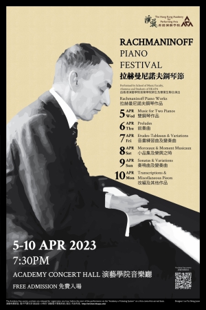為紀念俄羅斯作曲家拉赫曼尼諾夫誕辰一百五十周年,音樂學院將於四月五日至十日在演藝學院音樂廳舉行六場音樂會。鋼琴系學生與校友將會演奏拉赫曼尼諾夫多部作品,包括雙鋼琴作品及獨奏,這將會是香港有史以來的第一次。 2023-04-05:雙鋼琴作品2023-04-06:前奏曲2023-04-07:音畫練習曲及變奏曲2023-04-08:小品集及樂興之時2023-04-09:奏鳴曲及變奏曲2023-04-10:改編及其他作品