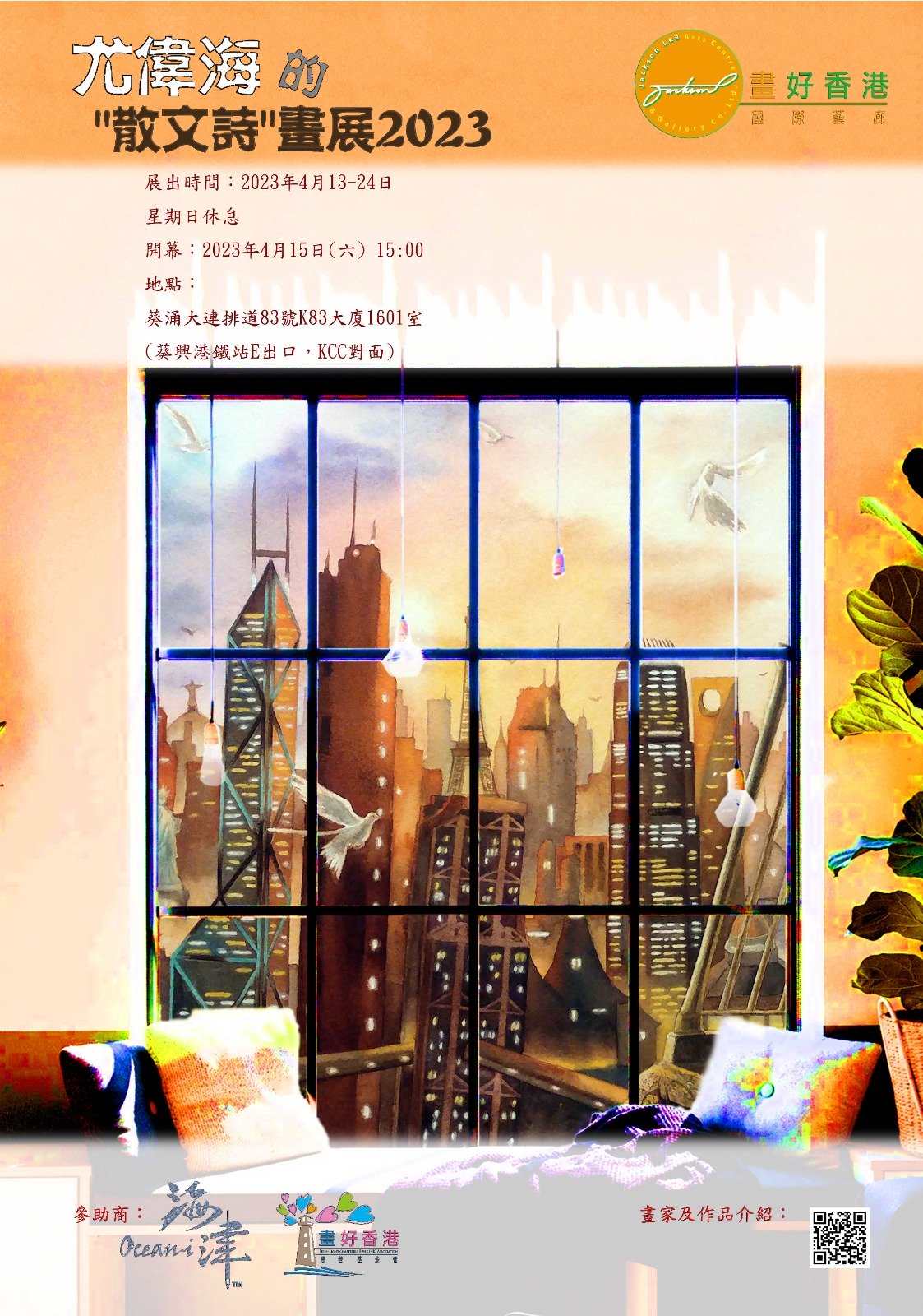 《尤偉海的散文詩畫展2023》定於2023年4月13日至4月24日舉行,開放時間為12:30pm-6:30pm。並於4月15日(星期六) 3:00pm舉行開幕禮及分享會。展覽於星期日,4月16日及23日休息。地點:畫好香港國際藝廊,葵興大連排道83號 (全新商廈) 1601室 (葵興港鐵E出口沿行人天橋步行約5分鐘,穿過KCC九龍貿易中心,過馬路即達)。是次展覽是愛好藝術人士不容錯過,讓你細味畫中詩意,與畫家、畫友互動交流。