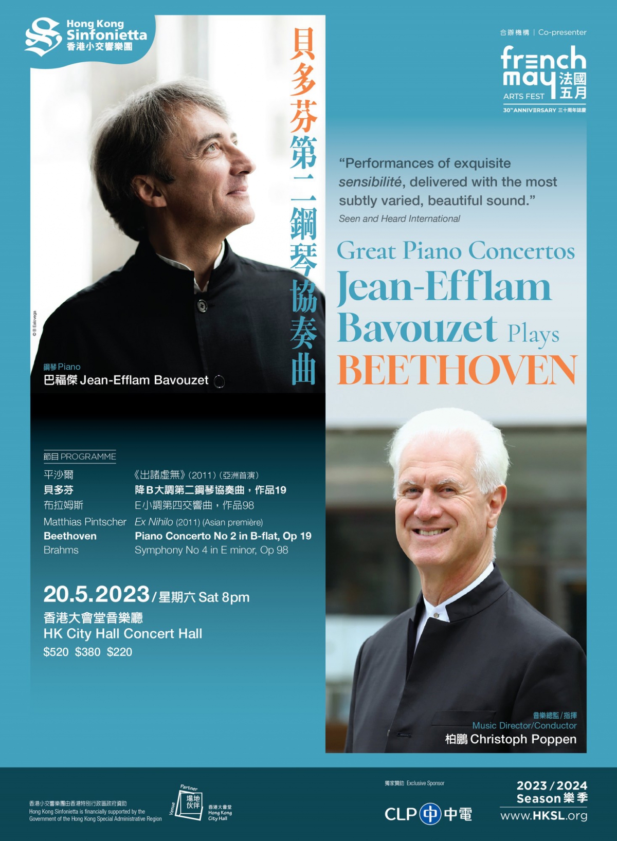 香港小交響樂團邀得法國鋼琴大師巴福傑來港演出,不但會以貝多芬的第二鋼琴協奏曲顯露他皇者般的琴技,亦會另外舉行獨奏會,一展法國鋼琴家之獨特魅力。在這首屬於作曲家早期的作品中可見貝多芬承襲著海頓和莫扎特的古典主義風格,體現了前人對貝多芬的深遠影響,並在追尋個人風格與秉承傳統之間埋下伏線。香港小交響樂團新任音樂總監柏鵬亦將帶領樂團演奏德國著名作曲家平沙爾所寫的《出諸虛無》之亞洲首演,以及布拉姆斯氣勢恢宏的第四交響曲。