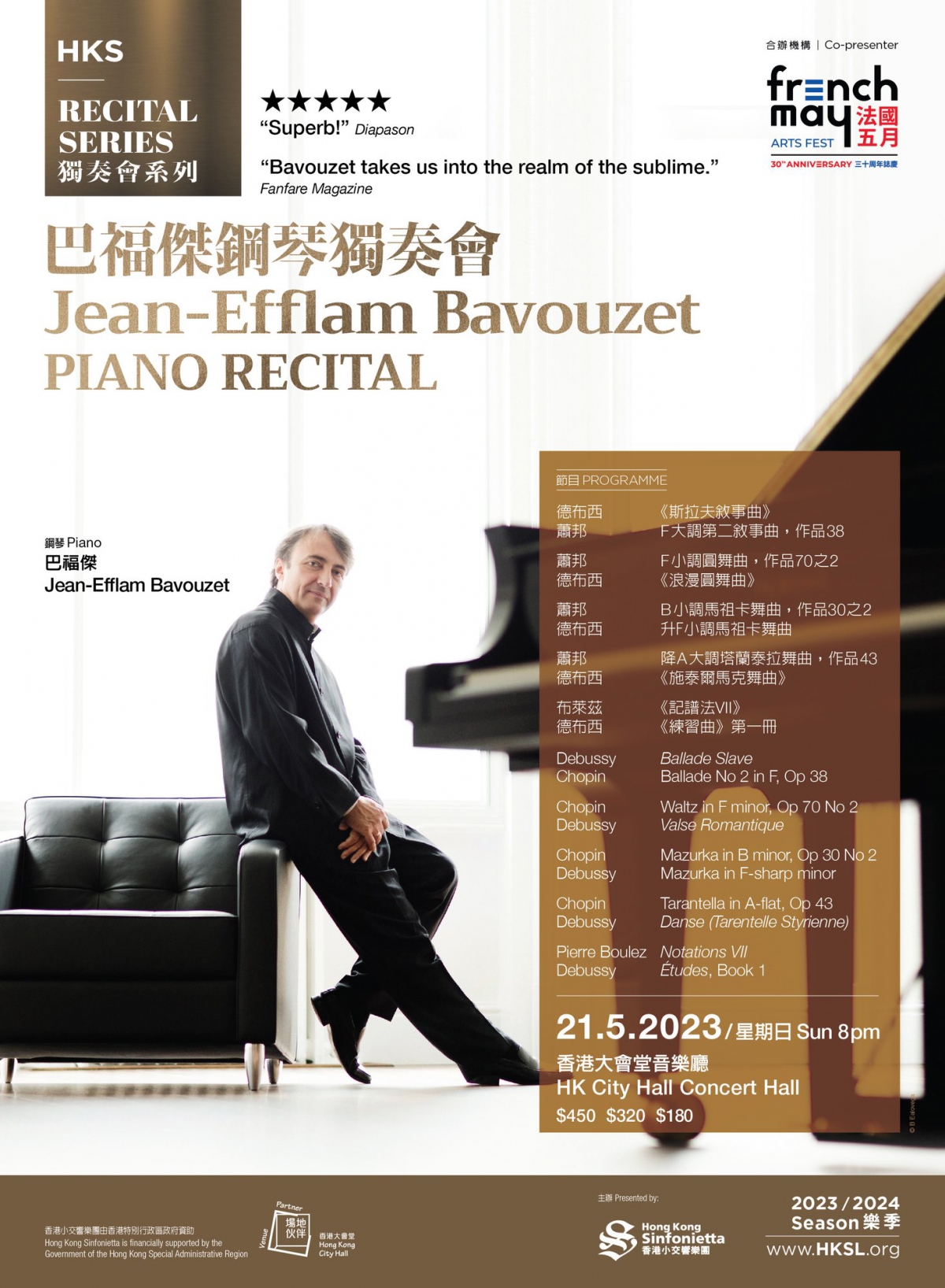 德布西對蕭邦的音樂情有獨鍾,對他的音樂啟發影響甚深,在這場與別不同的獨奏會上,享負盛名的法國鋼琴名家巴福傑,將以更迭交替的獨特編排方式演奏此兩位作曲家的多首敘事曲及舞曲,更會於下半場演繹法國當代音樂巨匠布萊茲的《記譜法VII》。巴福傑琴音高雅清晰、音感深刻而有創見,其灌錄的唱片屢獲年度唱片及法國金音叉獎,大師風采,不容錯過。