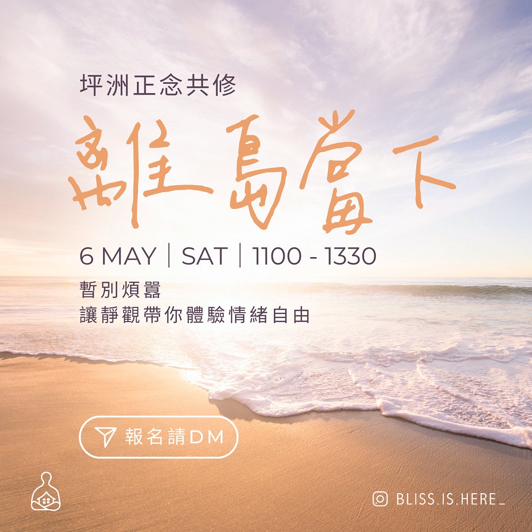 如果你日復日過住無意識嘅生活被情緒拖住走又或者已經被生活嘅壓力迫到好疲累試吓抽幾個鐘時間暫別煩囂俾自己換一個mode話唔定你會發現你可以重新過好你嘅生活邀請你,在五月嘅第一個星期六,在坪洲這個小島,一起透過修習正念,連結自己,回到當下,放鬆身心,亦學習接納情緒,體驗情緒自由