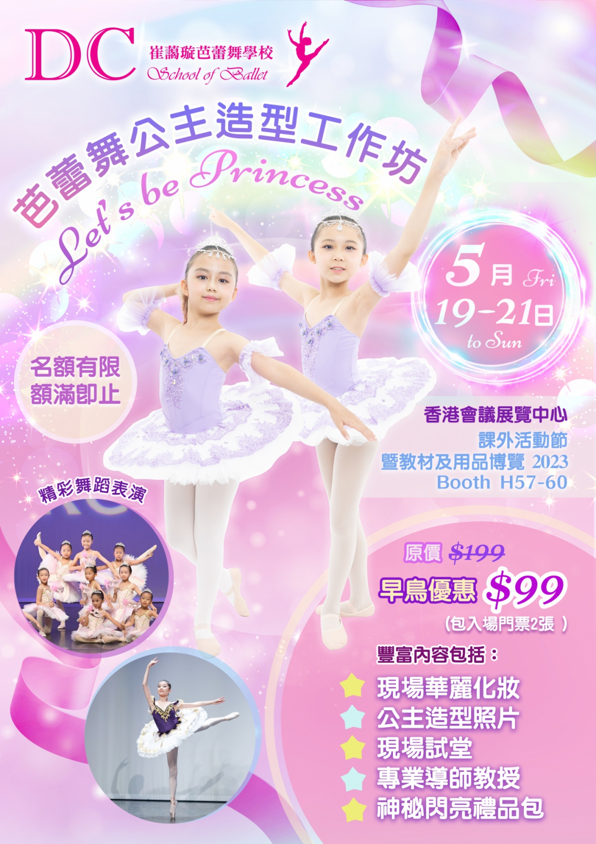 工作坊內容包括:1. 入場門票2張 ( 課外活動節暨教材及用品博覽2023 )2. 現場化妝、公主裙及頭飾借用 3. 公主造型照片1張4. 現場試堂及家長觀課5. 專業導師教授 6. 神秘閃亮禮品包1份