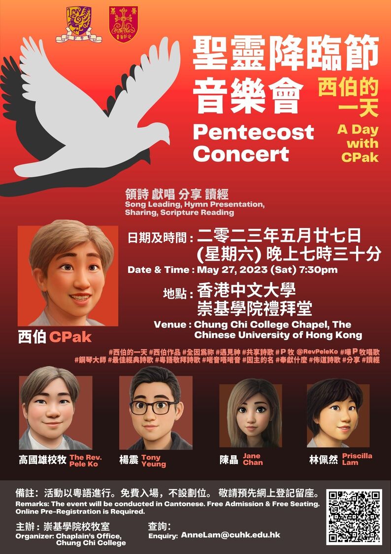 聖靈降臨節是教會年曆中其中一個最重要的節期。崇基校牧室將舉行年度「聖靈降臨節音樂會」,並邀得西伯 ( 著名粵語詩歌創作人,曾創作《遇見神》、《全因為祢》等粵語詩歌 )、 高國雄校牧、楊震 ( 鋼琴家 )、陳晶 ( 嘉賓 )及林佩然 ( 嘉賓 ) 於音樂會中領詩、獻唱、分享、讀經。歡迎任何人士參加是次音樂會!