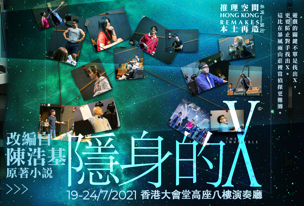 《隱身的X》是「解構本格推理的本格推理小説」。 在課堂上,大學教授以「找助教」的遊戲模擬本格推理Whodunit的結構,歷史上所有推理小説用過的「橋」,幾乎都可以從參與學生提出的諸多假設裡,找到對應。觀衆有如學生般,上了一堂「推理小説欣賞 – 創作與分析」的通識課,更參與了「誰是兇手」的搜尋過程。 這次演出是劇場空間「推理空間 – 本土再造」系列活動之一,更邀得兩位香港舞台劇獎「最佳男主角」馮祿德及鄭嘉俊同台鬥戲,定必劇力萬鈞。