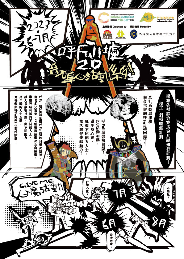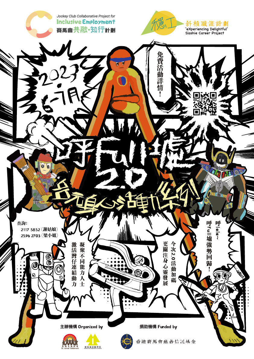 呼Full墟2.0由聖雅各福群會賽馬會共融知行計劃 -「穩工」斜槓職涯計劃及社區發展服務聯合主辦 ,冀透過活動向公眾散播自我關顧的重要性,提升社區人士對自身身心靈健康的關注。活動內容豐富,包括多元市集、文創藝術活動及正念(mindfulness)活動等等,一方面繼續希望透過與推廣身心靈的機構協作,提供相關元素的工作坊或活動,喚醒灣仔區内更多社區人士對身心靈健康的關注;另一方面連結社區内不同的人士,讓大衆參與社區,與不同能力及年齡的人士互動,凝聚歡樂的氣氛。