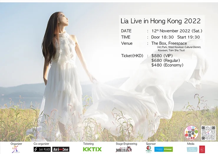 在《AIR》、《CLANNAD》、《Angel Beats!》等名作演唱「鳥の詩」、「時を刻む唄」、「My Soul,Your Beats!」等多首經典歌曲,其治癒系聲線極具感染力及穿透力的歌手Lia,將於今年11月12日在西九文化區自由空間大盒舉行個人演唱會「Lia Live in Hong Kong 2022」,敬請把握機會進場感受Lia宛如天籟之音的演繹,渡過一個美妙的晚上!