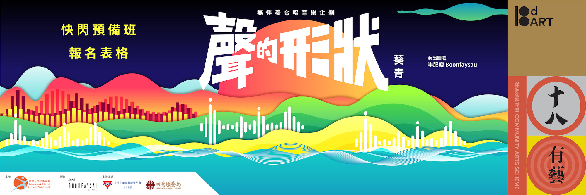 無伴奏合唱具備靈活多樣的人聲,交織多變的聲音效果,帶動觀眾的情感脈搏,同時巧用聲浪的流動特性,傳播至迥異不同的場域,哪怕是最狹小的,抑或最寬廣的,歌聲都足以引起共鳴,就像藝術可以在社區每一個角落,點亮別人的故事一樣。「聲的形狀-葵青」與參加者處身區內不同場域,讓聲音走進社區的大街小巷:遊樂場、海岸線、咖啡室、演藝廳,重塑公共空間的想像輪廓,讓人聲交錯結聚,一探葵青的栩栩色相。