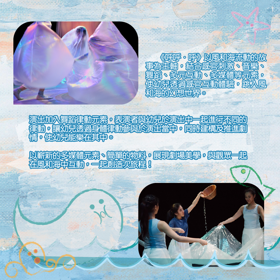 《呼呼.呼》以風和海流動的故事為主軸,結合感官刺激、音樂、舞蹈、多元互動、多媒體等元素,使幼兒透過感官互動體驗,跳入風和海的幻想世界。同時加入舞蹈律動元素,表演者與幼兒於演出中一起進行不同的律動,讓幼兒透過身體律動參與於演出當中,同時建構及推進劇情,使幼兒能樂在其 中。此外,以嶄新的多媒體元素、簡單的物料,展現劇場美學,與觀眾一起在風和海中互動,一起創造今次旅程!