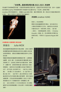早前獲不同背景舞蹈家申請,支援他們排練場地及創作等,經過多月來的研習及沉殿,其中一位藝術家洪俊樂Jonathan將透過展演與分享會展示他在數月來在「多空間」駐場的得著。Jonathan更特別邀請好友—— 莫蔓茹Julia MOK 相助,擔任現場音樂一職。兩位多才多藝的舞蹈家同台演出,會為大家帶來什麼意想不到的驚喜呢?