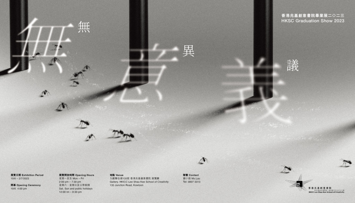 如何定義一件事情有沒有意義?甚麼是意義?你認為的無意義就能判定這件事物的價值了嗎?有人說:螞蟻這樣弱小,卻妄想搬起比自己體積大上數倍的物件,是徒勞的,是無意義的;可是當螞蟻目標一致團結起來的時候,便能發出驚人的力量。意義是主觀的,一些旁人無法理解、判定是無意義的事物 ,在我們眼中卻是一件富有意義的寶物。無意義又如何?有人理解便夠。建基於這個說法,在無意義這件事上,我們無異議。該次展覽由書院多名應屆畢業生策展,包含不同媒介的創作,歡迎各界人士蒞臨參觀。
