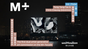 《墨 · 脈》由台灣藝術家董陽孜與香港媒體藝術家張瀚謙共同創作。M+首次委約兩位不同領域的藝術家合作,因應M+幕牆特色,創作此場域特定生成藝術作品。《墨 · 脈》透過演算程式生成,靈感源自董陽孜多年來創作時所留下、名為《無聲的樂章》的一百幅「點畫」與「筆勢」,並以此系列為基礎,探索董陽孜的水墨於正負空間的能量流動,視奏圖像記譜。
