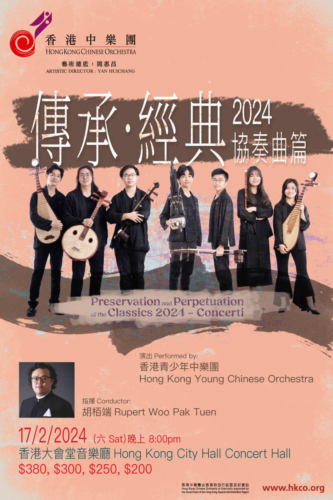 「傳承.經典」進入第四年,香港青少年中樂團選出優秀團員:陳璵晉(環保二胡 )、胡珈城(環保高胡)、陳爾力(琵琶)、吳潔穎(琵琶)、宮嘉豪(中阮)、郭上瑜(笛子)及施朗希(高音笙)擔任協奏演出,傳承演繹大師作品。樂團亦委約入圍「心樂集」的年青作曲家為青少年中樂團度身訂做新曲,今次由陸尉俊創作《望飛翔》,展現團員植根傳統,融會創新的活力。