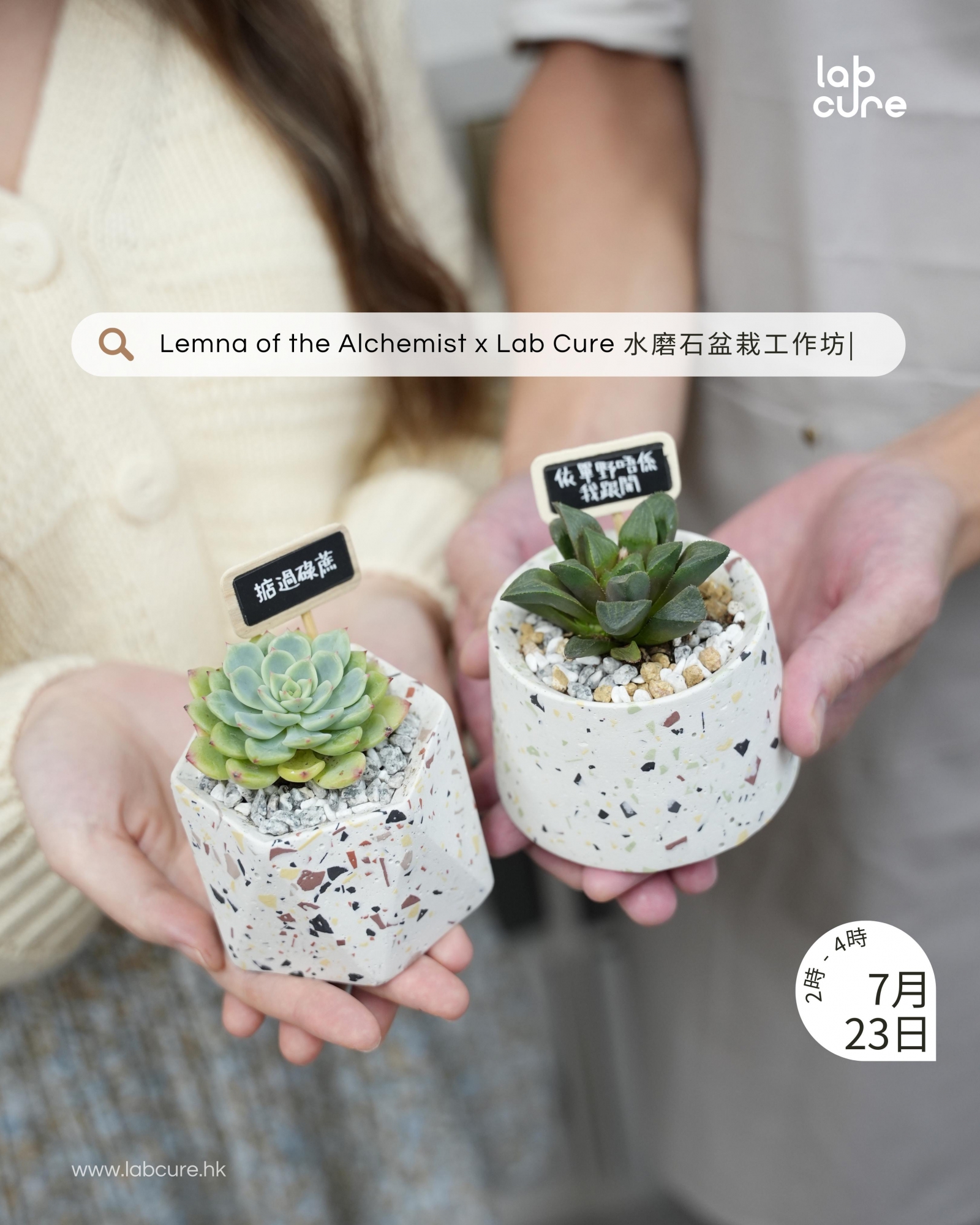 將舊建築中常見的水磨石批蕩轉化成花盆製作的工藝,並透過活潑的色彩搭配出獨特的外觀。工作坊將教授倒模技巧、打磨手法、打理盆栽方式等。學生能根據個人喜好,挑選模具和自由配搭喜歡的顏色進行創作。完成盆器製作後,能夠體驗栽種綠植*的過程,為作品添上最後的點綴。
