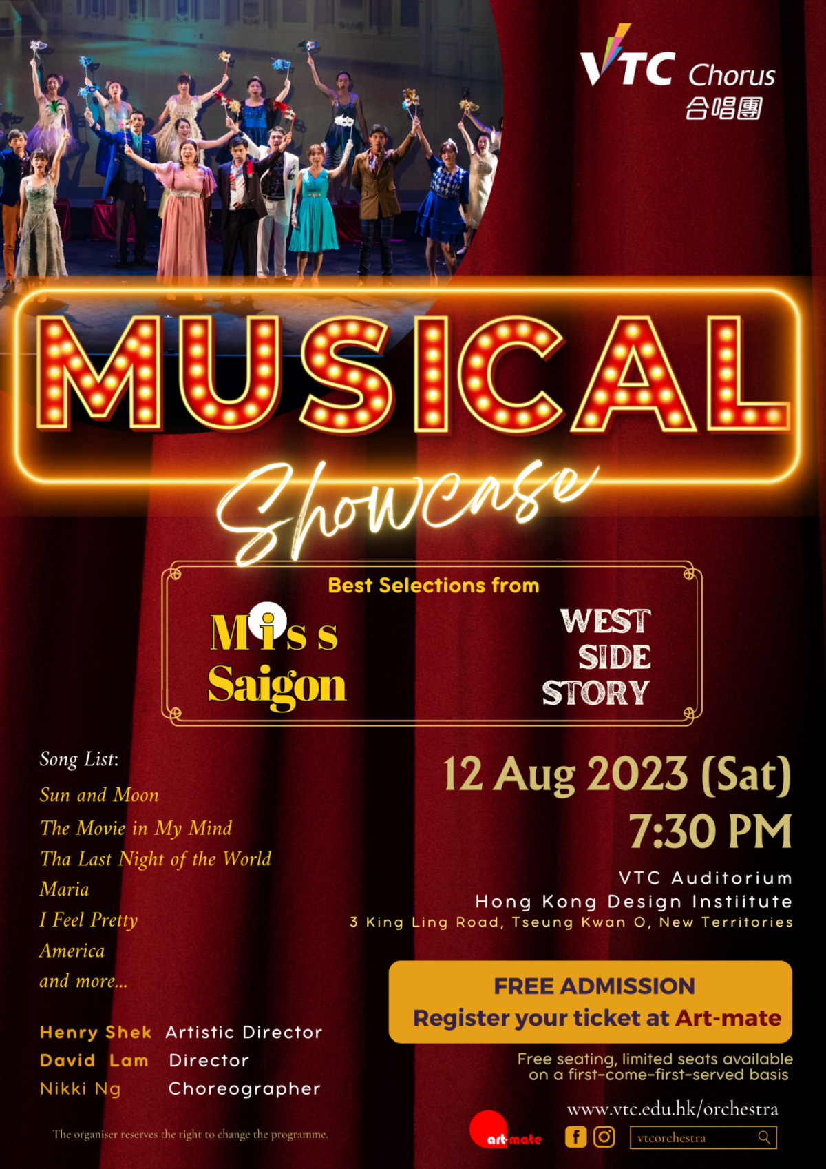 VTC 合唱團呈獻兩套百老匯經典音樂劇《西貢小姐》及《西城故事》精彩選段,演繹 I Feel Pretty、America、Sun and Moon、Movie in My Mind 等多首動人樂曲。