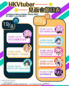 舞台表演方面,我們很榮幸邀請到著名日本動漫歌曲演唱團隊、日本動漫DJ及聲優事務所派員來港出演,為大家帶來一場聽覺上的盛宴。而新設立的「香港Vtuber主題區」除了同人攤位外,我們更增設與香港Vtuber現場見面的環節,讓各位粉絲們能夠即時透過場內的LED螢幕,與自己推的Vtuber(們)作現場互動!