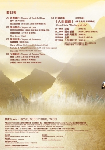 音樂會曲目豐富,包括五組小主題:青蔥歲月(成長篇)、愛的誓約(愛情篇) 、自強不息(奮鬥篇) 、夕陽如詩(自在篇) 及合唱詩篇《人生組曲》(總結篇)。回味人生不同階段的經歷,通過音樂感悟邁步人生的苦與樂和意義。節目形式豐富,有男女聲二重唱及混聲合唱、男中音及女聲合唱、四重唱、男女聲小合唱及小提琴演奏等。