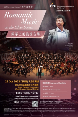 由國際著名指揮家石信之帶領的VTC交響樂團及合唱團,將以「銀幕上的浪漫音樂」為主題,演繹多首悅耳動聽的中西電影樂曲,包括電影「鐵達尼號」、「職業特工隊」、「人鬼情未了」、「舒特拉的名單」、「文明帝國VI」、「最愛是誰」、「小李飛刀」等主題音樂,引領聽眾一起投入浪漫的光影世界。