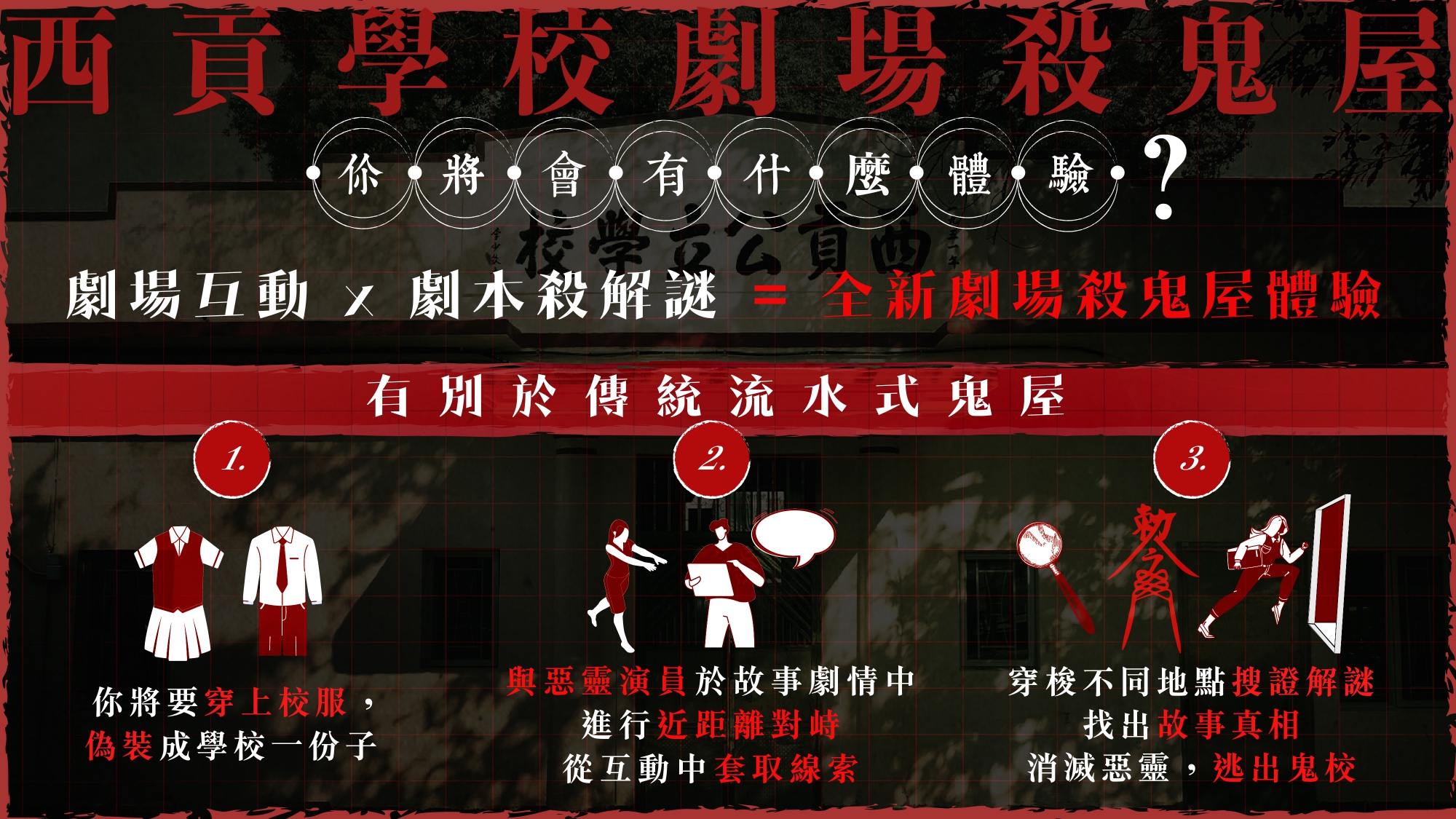 由 Mental Bread@港式情侶全力製作《鬼域結界 西貢公立學校》將於今年十月同大家過一個恐怖港式萬聖節!鬼屋結合互動式劇場及解謎元素,成為獨一無二的劇場殺體驗,玩家將成為故事角色,在120分鐘內以小組的形式在古蹟學校內,根據故事發展與惡鬼近距離對峙互動,找出方法超渡怨靈,逃出鬼校。