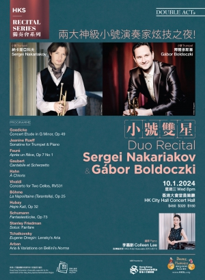 過去曾兩度獲香港小交響樂團邀請來港演出的神級小號演奏家納卡里亞科夫,其獨門造詣令樂迷嘆為觀止,一票難求!納卡里亞科夫將於2024年重回香港,除了與樂團演出之外,還會夥拍份屬好友的匈牙利小號天王博爾多斯基一起同台舉行獨奏會,除了個人炫技,亦會雙劍合璧演奏合奏作品!他們精心策劃多首名曲及為小號改編的古典作品,更有本地星級鋼琴家李嘉齡協力助陣,絕對令人引頸以待!