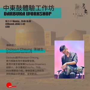 中東鼓 Darbuka中東地方主要手鼓之一,流行於埃及、敍利亞等地。高腳杯形金屬外殼加上纖維鼓皮,配合掌法及指法拍打,演奏出千百節奏。除了其音樂重要性外,中東鼓還是一種重要的文化象徵。常見於肚皮舞伴奏、婚禮、 節日和其他慶典中演奏,是中東和北非文化的重要組成部分。// 工作坊內容 //- 中東文化及歷史簡介- 演奏中東鼓的手法及姿勢- 學習基礎中東節奏**完成體驗班可參加《中東鼓恆常研習班》持續學習**