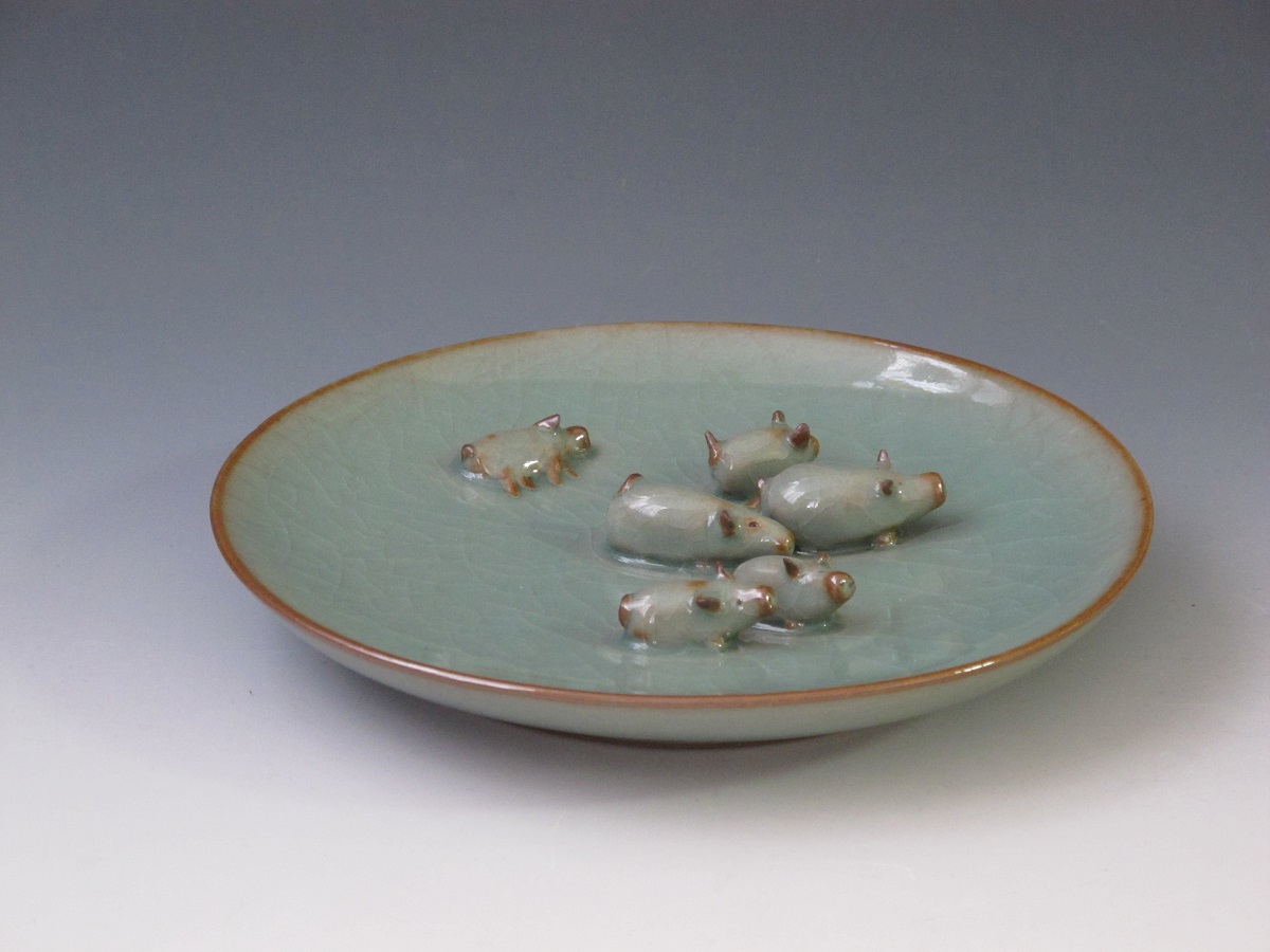 在黃美莉芸芸作品中,她的青瓷系列最令人眼前一亮。青釉是中國最早出現的釉色,其中以龍泉窰所燒製的梅子青及粉青更享負盛名,特別是梅子青存世作品極少,尤其引人入勝。黃美莉早在20多年前已經到龍泉窰交流學習,亦為當地工藝師引入西方陶藝技巧。《黃美莉喜色》中展出的「梅子青四季花瓶」及「樂融融‧盤」正是黃美莉在龍泉窰燒製的精品。前者拉坯成形,以刻花點綴,釉色精瑩潤澤,淡雅素淨;後者以拉坯結合手塑,造型樸實稚趣,含鐵量高的瓷土在薄釉下隱露原來的鐵褐色,重現「紫口」及「鐵足」的中國特色陶藝。