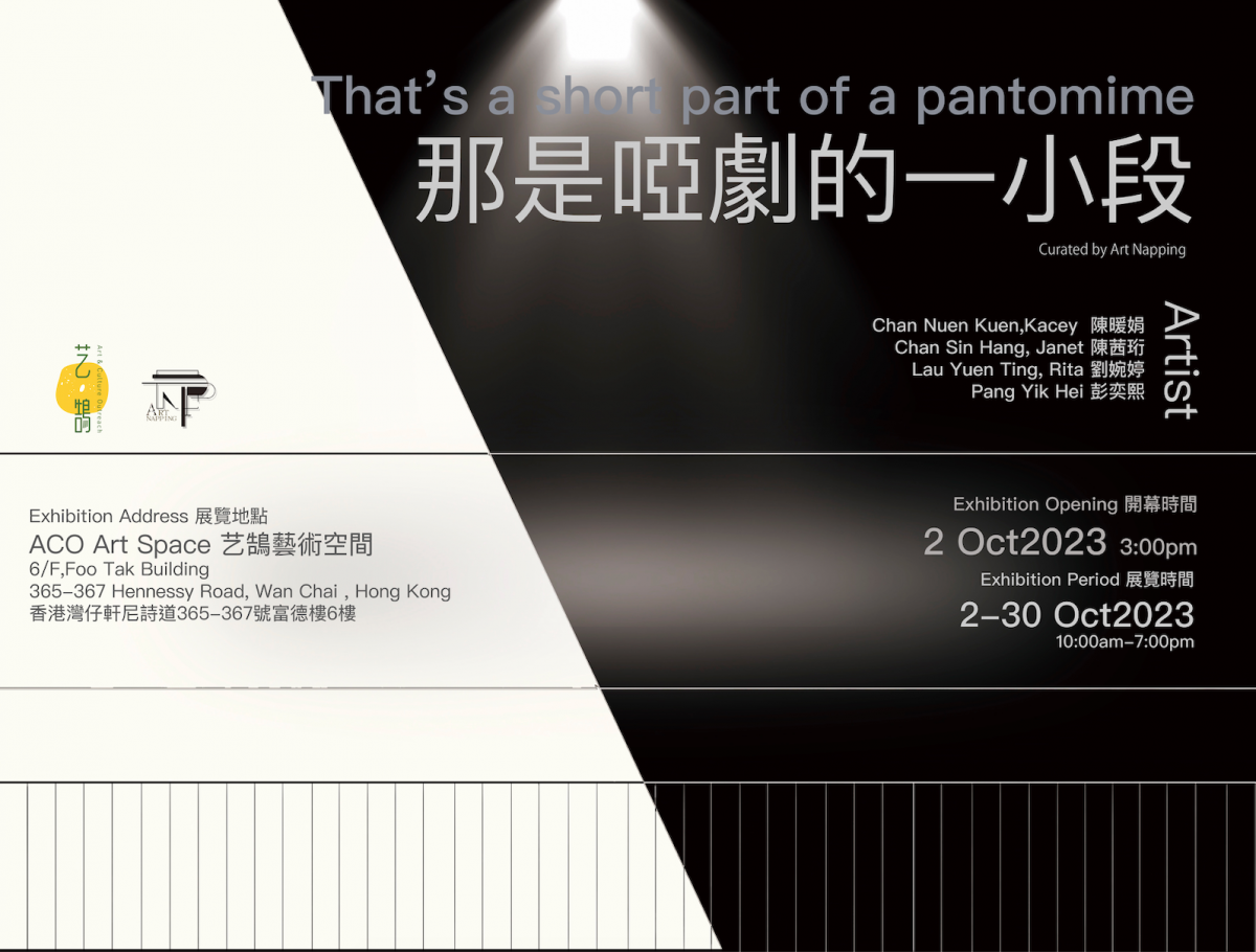 畫的本身就是每一個靜默回憶的呈現,安靜沉默以待此時被觀看著。在畫的背後是一場場無聲的表演,把一連串作畫的動作想像成一小段啞劇。每一小段的啞劇都注入了表演者的精神和靈魂,深藏於內心的輕言細語悄悄地透過作為舞臺的畫布表現出來。在此歡迎你來到這一個由畫作構成的劇場。開幕時間: 2023 10-02 ( 3:00 pm )