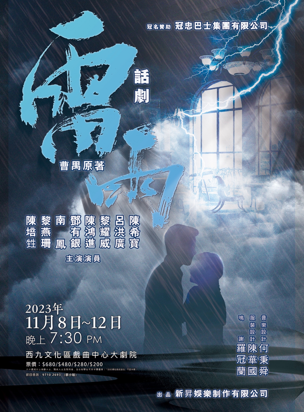 由新昇娱樂制作有限公司主辦的「雷雨」將於2023年11月8至12日在戲曲中心大劇院舉行。