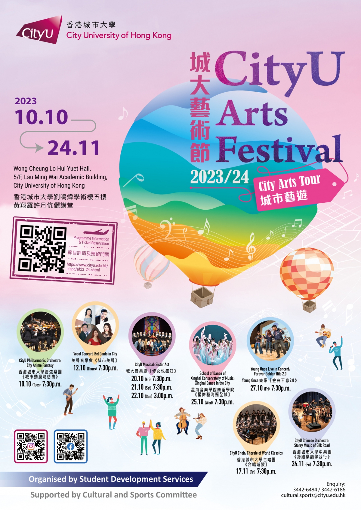 自2015年起, 由城大學生發展處主辦、文康委員會贊助的《城大藝術節》呈獻琳瑯滿目的文化節目,建立城大表演者與專業藝術家的交流平台。藝術節不僅鼓勵學生以藝術為終生興趣,更豐富校園的藝文氣息,成為年輕人與社區的藝術樞紐。本年度《城大藝術節》將於2023年10月至11月舉行,為觀眾帶來一系列包括音樂會及音樂劇的精彩節目。