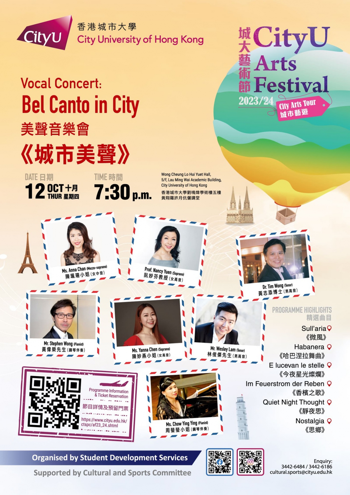 鳥聲、風聲、車聲、廣播聲、腳步聲…… 互相交疊,製造出一片片城市聲景。美麗聲景的拼圖中不能缺少歌聲。音樂會邀請一眾著名聲樂演唱家親臨城大校園,以源於17世紀意大利的「美聲」技巧,細膩演繹不同語言的聲樂作品,讓你在這繁囂的城市裡,感受蘊藏的豐富情感,與聲樂演唱家們沈醉於這城市美聲之中!