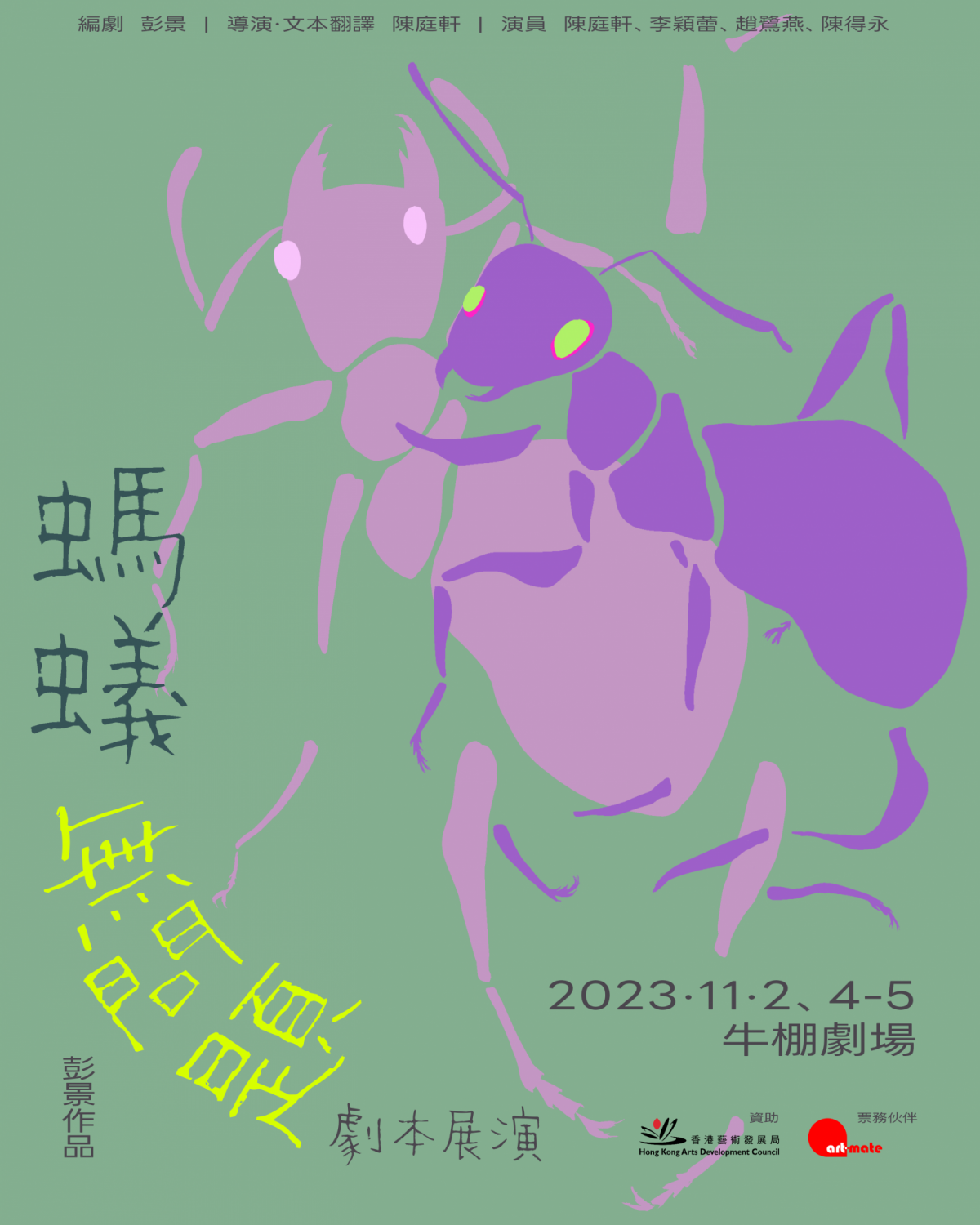 「我哋究竟喺度做緊咩?走緊佬?搵嘢食?定係我哋俾人揼低咗?」一處死亡迴旋,兩隻螞蟻,一場相遇。世界另一側,一扇門打開,兩個陌生人,一次深夜到訪。一個未完的故事,一隻未跳完的舞,等等⋯⋯好像忘了,還差一個擁抱。節目全場約1小時30分鐘,遲到者將於合適位置方可進場節目含不雅用語香港藝術發展局全力支持藝術表達自由,本計劃內容並不反映本局意見。