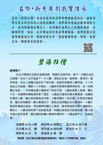 是次《碧海狂僧》演出由資深演員帶領粵劇新秀演出,讓新秀們有更多與老信同合演出的機會。我們期待透過這種實踐的方式,新秀們能夠在舞合上,找到屬於他們自己的獨特風格,並繼續學習、演出,以承傳這份珍貴的粵劇藝術。我們的願景是讓粵劇藝術在每一個新的世代中,都能織續燃燒、燃燒,並照亮每一個藝術家的道路。