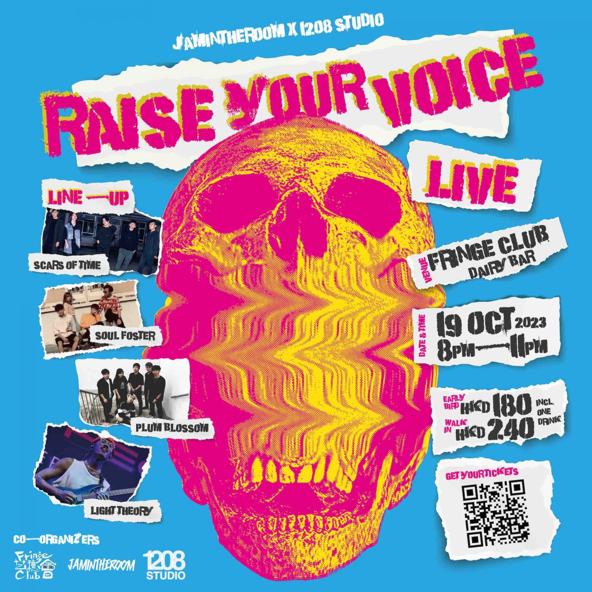 Fringe Club X1208 Studio X JamintheRoom Raise Your Voice 演出系列,希望定期舉辦現場演出,搵到更多志同道合嘅音樂朋友 更多唔同嘅現場音樂,唔同嘅Line-up,先可以聚合更強大力量,創造更多嘅聲音!今次找來Soul Foster﹑Scar of Time﹑Plum Blossom以及 Light Theory 四隊樂隊一同共演,欣賞新生代樂隊嘅火花。