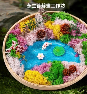 裝在竹匾的大自然,DIY竹匾苔蘚微景觀。一把把不同颜色的苔蘚,加幾塊生石, 加上自然生態及裝飾物等,便能輕鬆建構出我們嚮往的美景。擺放在桌面或窗台,從此不必舟車勞頓亦可親近大自然, 既養眼又可治愈,將童話搬進現實。