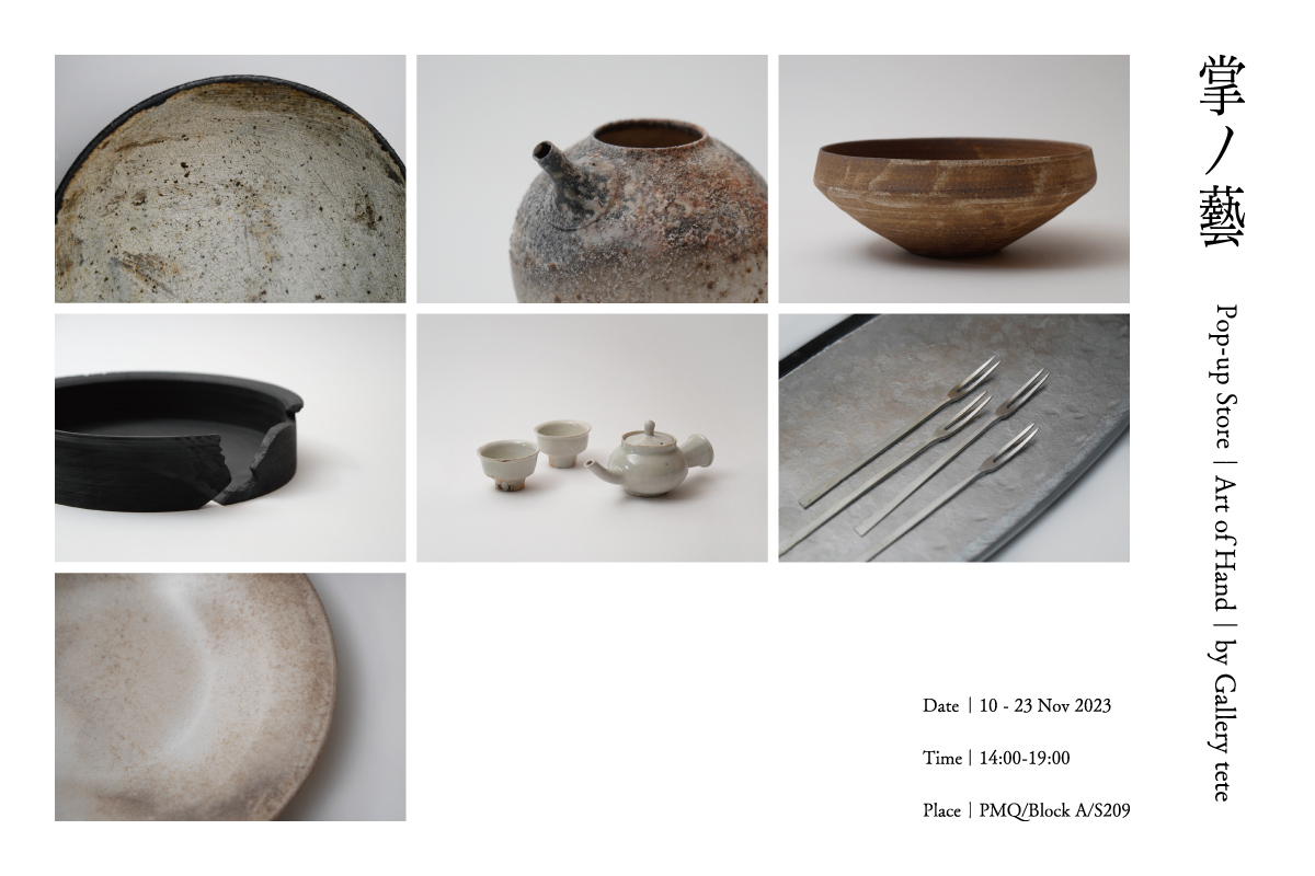 Gallery tete 將由2023年11月10日至23日,以「手之藝術」為題,再次短期設店於PMQ。是次活動邀請了7位來自日本的工藝家合作,分別包括陶器、木器及金工,以「日常生活」思考理念提供大家生活所需的器物。希望大家親身來感受由掌而衍生的形狀美學及它們所帶來的意境,並親手感受它們各自獨特的氛圍。觸得到的手作痕跡,感受掌心傳遞的溫暖,來⼀場生活之器的探索及體驗日本工藝家的日常點滴。