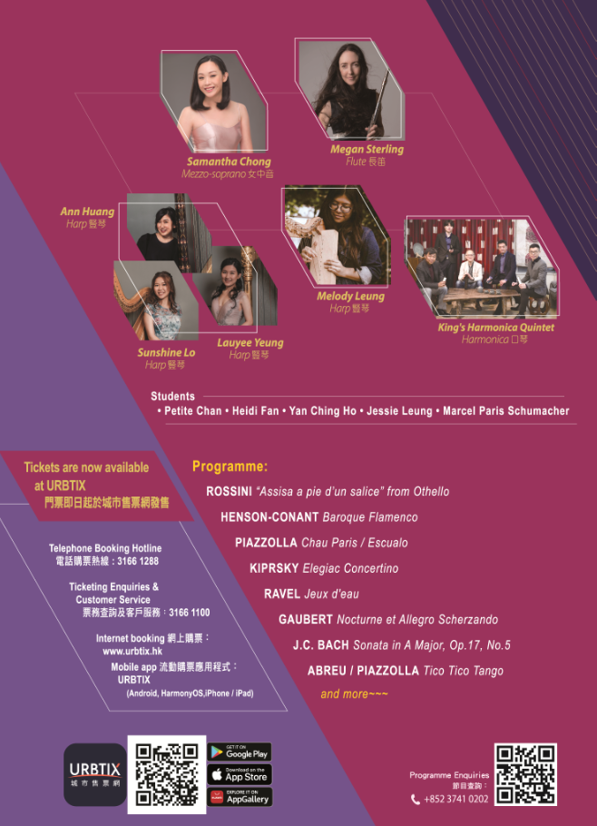 此次音樂會觀眾還將欣賞到本港一眾年齡由10 歲開始,曾多次在各國際豎琴比賽得獎的後起之秀同台炫技演出。