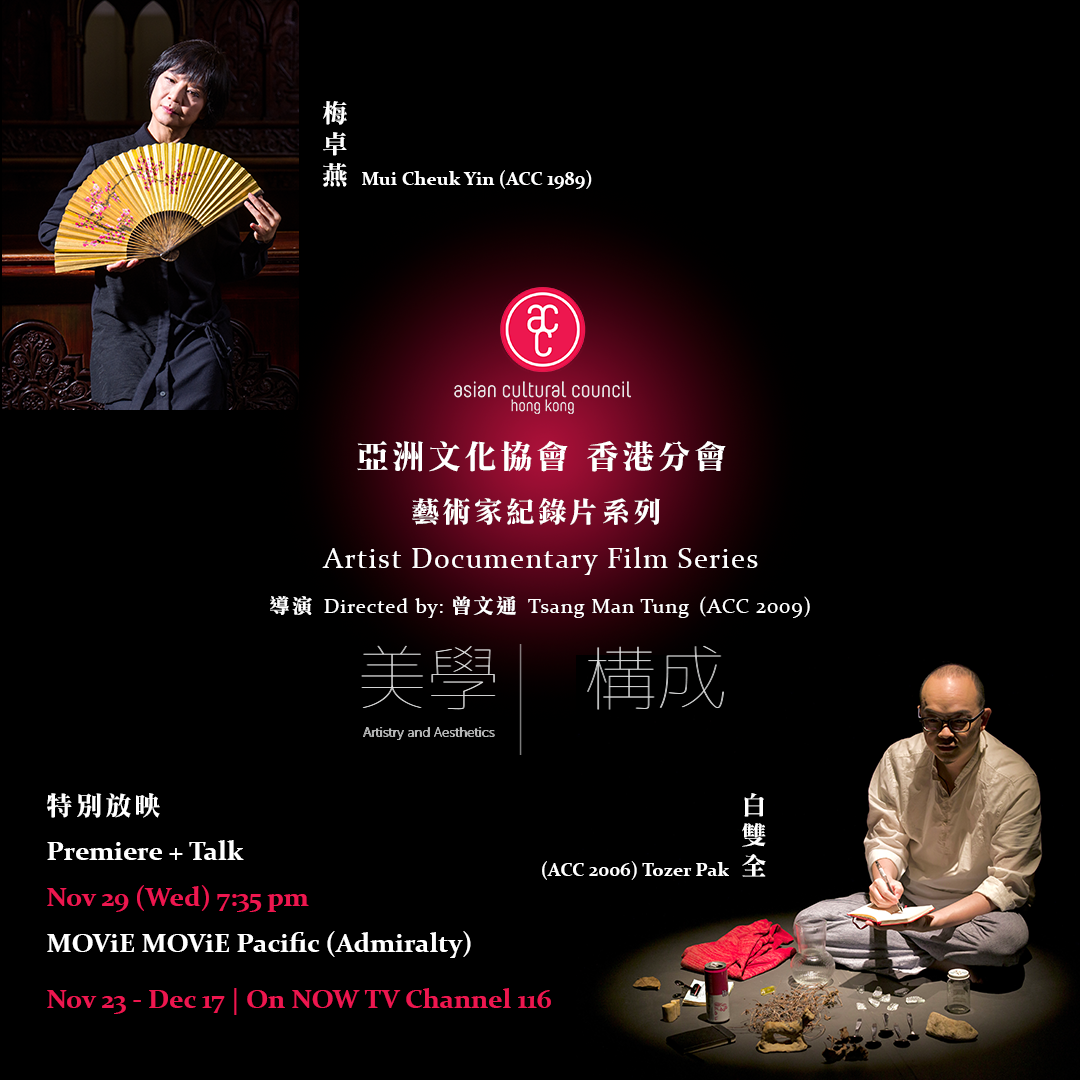 亞洲文化協會(ACC)香港分會呈獻《藝術家紀錄片系列》,由ACC會友分享他們的藝術之旅及文化交流對其藝術實踐的影響。是次特別放映兩位會友的錄像,包括以即興獨舞而聞名的舞蹈家梅卓燕(ACC 1989),以及把創作視為對常規事件介入的藝術家白雙全(ACC 2006)。