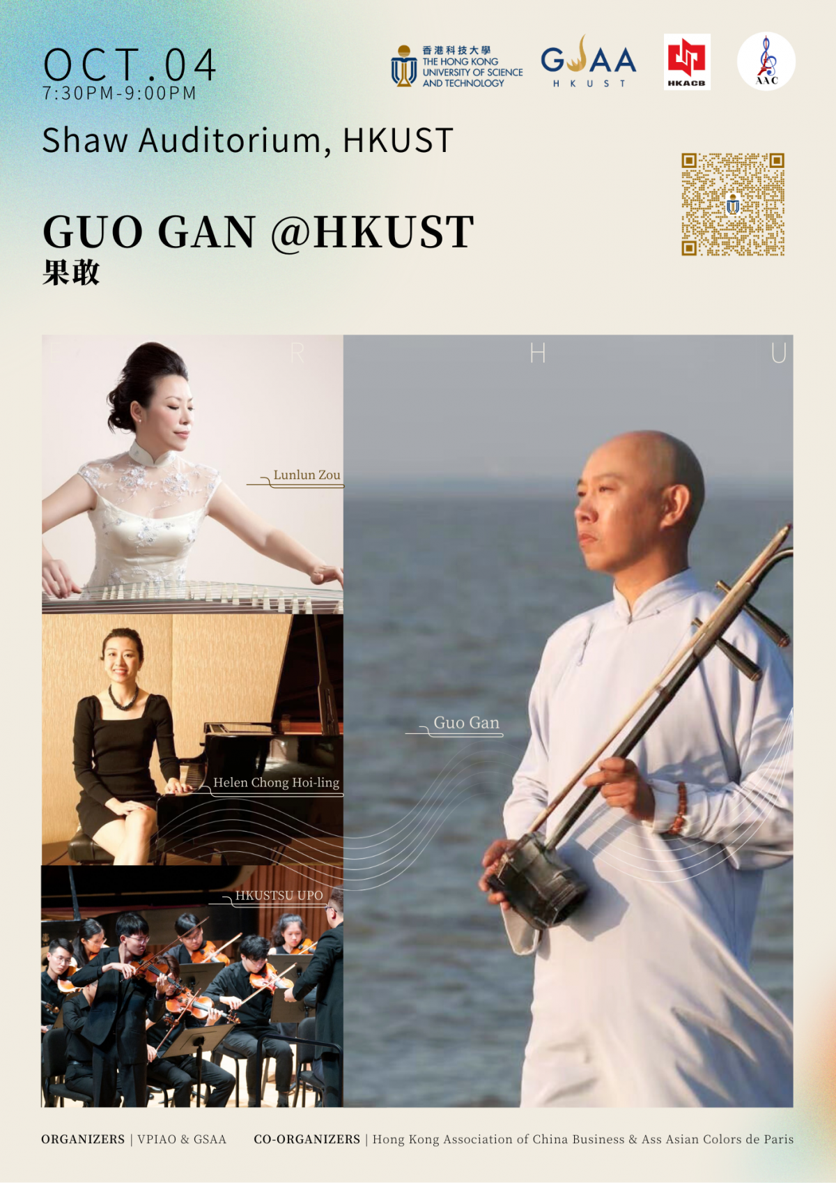 國際二胡大師果敢攜手古箏大師鄒倫倫、鋼琴家莊凱鈴及年青音樂家陳柯亦呈獻“Guo Gan @HKUST”音樂會,演出曲目包括經典名作《戰颱風》、與香港科技大學學生會管弦樂團成員合奏《獅子山下》以及多首原創二胡曲。