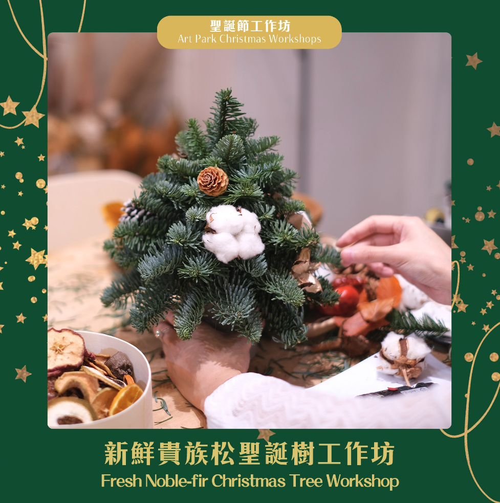 今年聖誕節,藝術公園舉辦一系列聖誕工作坊,包括「聖誕雪人水晶球 + 新鮮貴族松聖誕圈」、「新鮮貴族松聖誕樹」及「新鮮貴族松聖誕花環」,讓大家可於戶外空間放慢生活節奏,製作獨一無二的聖誕飾品,打造一個充滿儀式感的聖誕節,同時留下温馨甜蜜的回憶。