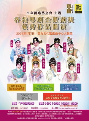 由生命勵進基金會有限公司主辦的香港粵劇金紫荊獎優秀作品匯演將於2024年1月7日在戲曲中心大劇院舉行。何文秀會妻:文華、梁燕飛六月雪之大審:阮德民、林芯菱活捉張三郎:詹浩鋒、林子青碎鑾輿:宋洪波、黃寶萱雷鳴金鼓戰笳聲之送別:阮德民、梁燕飛