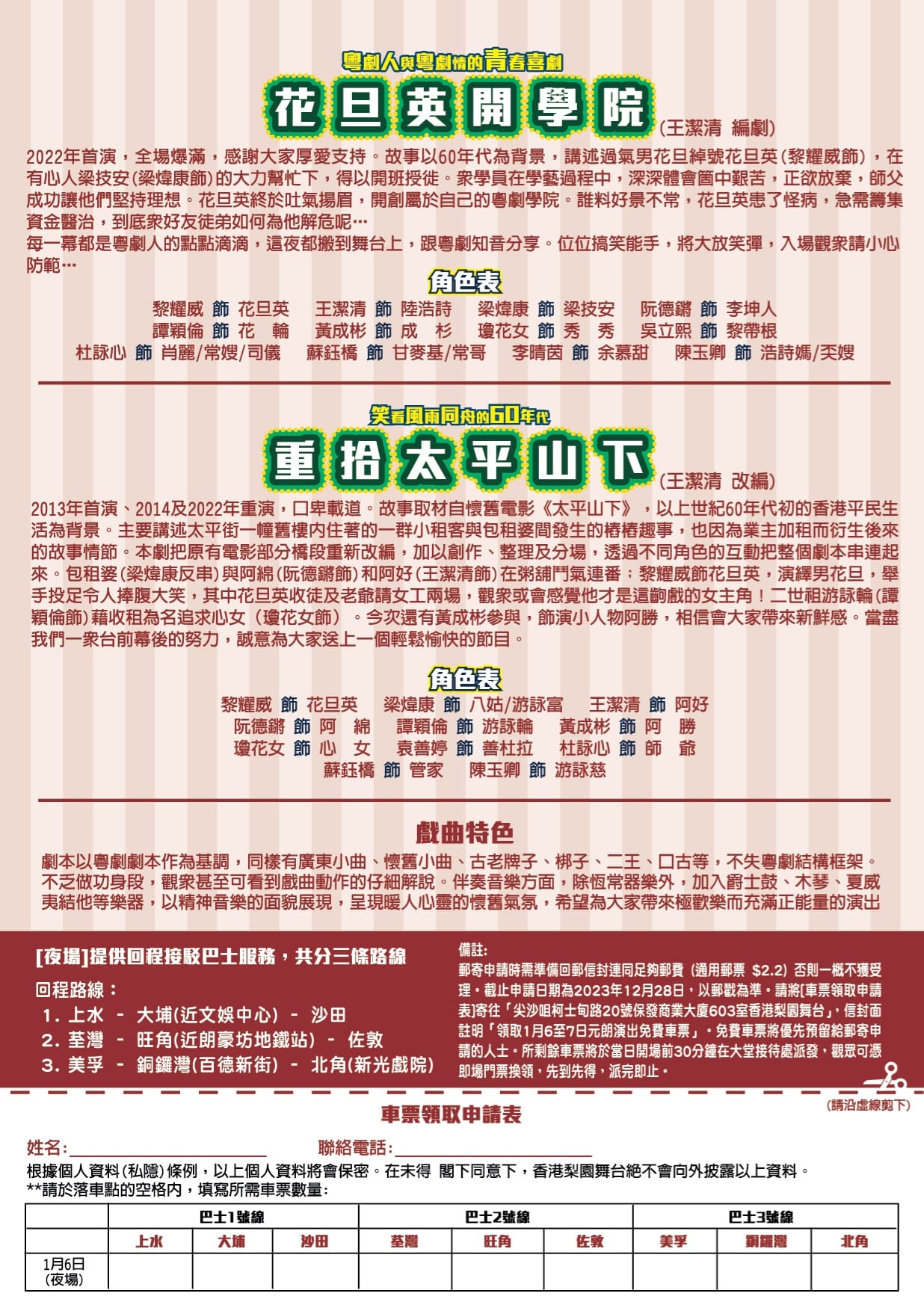 2013年首演、2014及2022年重演,口卑載道。故事取材自懷舊電影 《太平山下》,以上世紀60年代初的香港平民生活為背景。主要講述太平街一幢舊樓内住著的一群小租客與包租婆間發生的椿椿趣事,也因為業主加租而衍生後來的故事情節。本劇把原有電影部分橋段重新改編,加以創作、整理及分場,透過不同角色的互動把整個劇本串連起來。包租婆 ( 梁煒康反串 ) 與阿綿 ( 阮德鏘飾 ) 和阿好 ( 王潔清飾 ) 在粥舖鬥氣連番;黎耀威飾花旦英,演繹男花旦,舉手投足令人捧腹大笑,其中花旦英收徒及老爺請女工兩場,觀眾或會感覺他才是這齣戲的女主角!二世租游詠輪 ( 譚穎倫飾 ) 藉收租為名追求心女 ( 瓊花女飾 )。今次還有黃成彬参與,飾演小人物阿勝,相信會大家帶來新鮮感。當盡我們一衆台前幕後的努力,誠意為大家送上一個輕鬆愉快的節目。