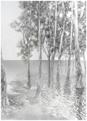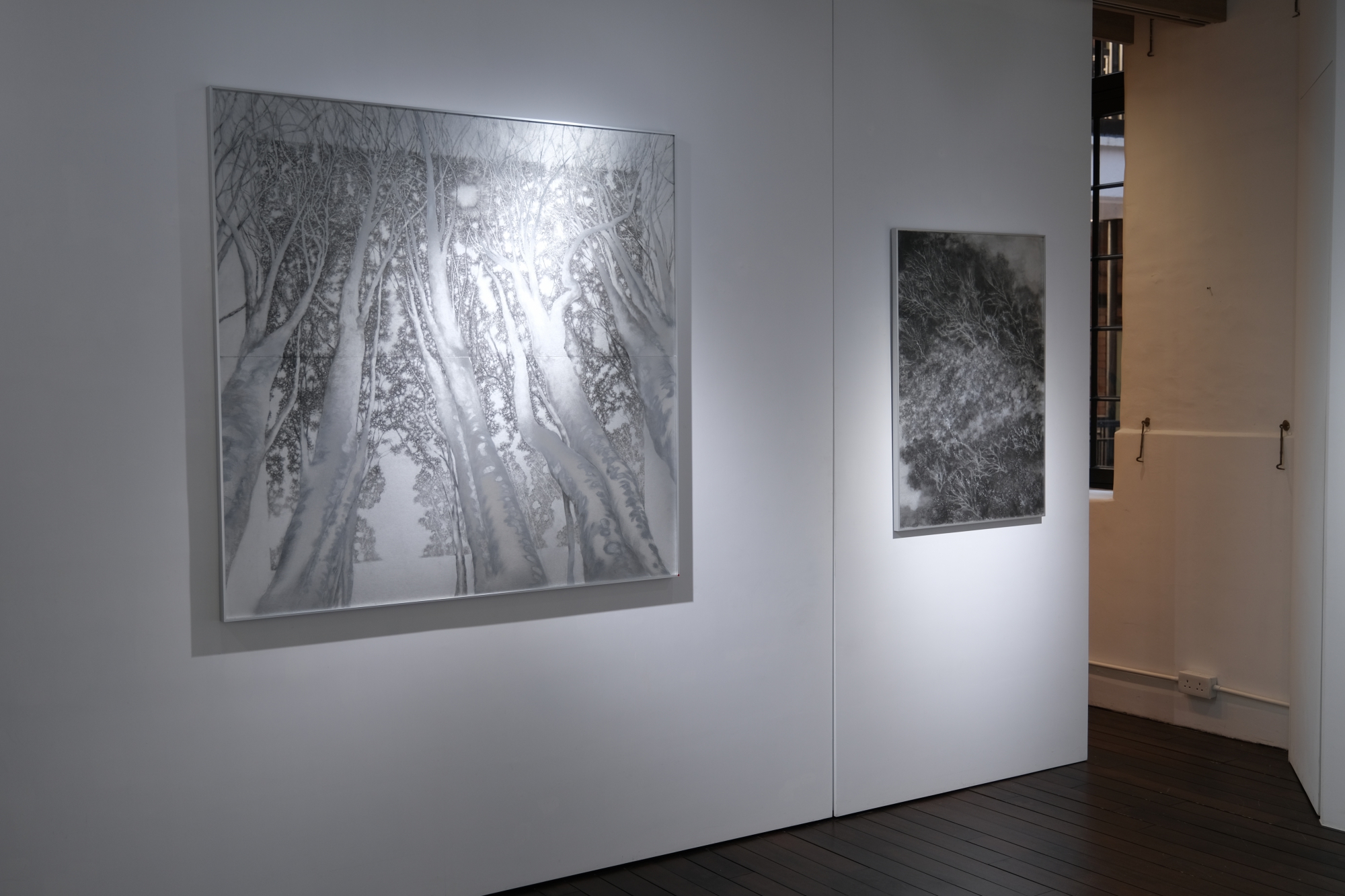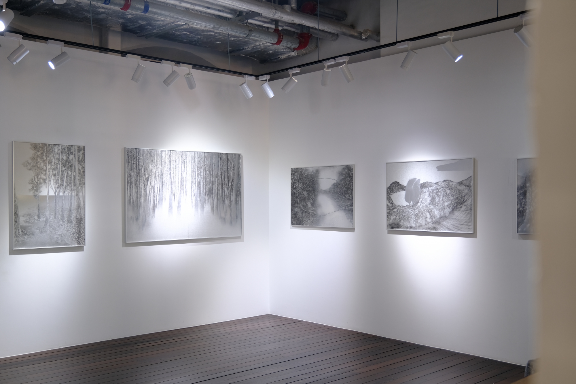 是次劉錦紅個人展覽「銀白之景」以生活中真實的景物回應主題「風雨陰晴」,亦都承繼了文人山水畫的脈絡,將其融入創作,呈現對當代風景畫的另一種想像。而在以「古代風格」演繹「當代情境」的同時,劉氏亦以「當代材料」呈現出「古代筆墨」。劉氏以石墨和銀漆作為繪畫媒介,以極富個人特色的風格演繹當代風景,作為獨具個人視覺語言的表達,闡釋與致敬了綿延千年的水墨哲學,並建構出極富深度與廣度的解讀空間。劉氏的創作中,最具特色的便是他筆下的樹,那些看似普通,卻擁有不同特質與豐富細節的樹。生活在高度城市化的香港,城市中的樹木可貴而又難得,如若細心留意,便可發現這「枯榮之間」蘊含著無窮盡的哲理與美感。劉氏深知「以小見大」在藝術表達上的精妙之處,便將生活中出現的一隅「微觀」景象成為畫作中重點刻畫的元素,以細膩的筆觸表達出一種確定的詩意追求。