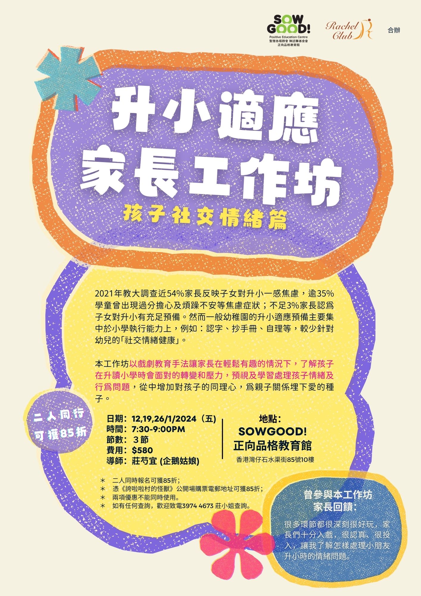 2021年教大調查近54%家長反映子女對升小一感焦慮,逾35%學童曾出現過分擔心及煩躁不安等焦慮症狀;不足3%家長認為子女對升小有充足預備。然而一般幼稚園的升小適應預備主要集中於小學執行能力上,例如:認字、抄手冊、自理等,較少針對幼兒的「社交情緒健康」。本工作坊以戲劇教育手法讓家長在輕鬆有趣的情況下,了解孩子在升讀小學時會面對的轉變和壓力,預視及學習處理孩子情緒及行為問題,從中增加對孩子的同理心,為親子關係埋下愛的種子。