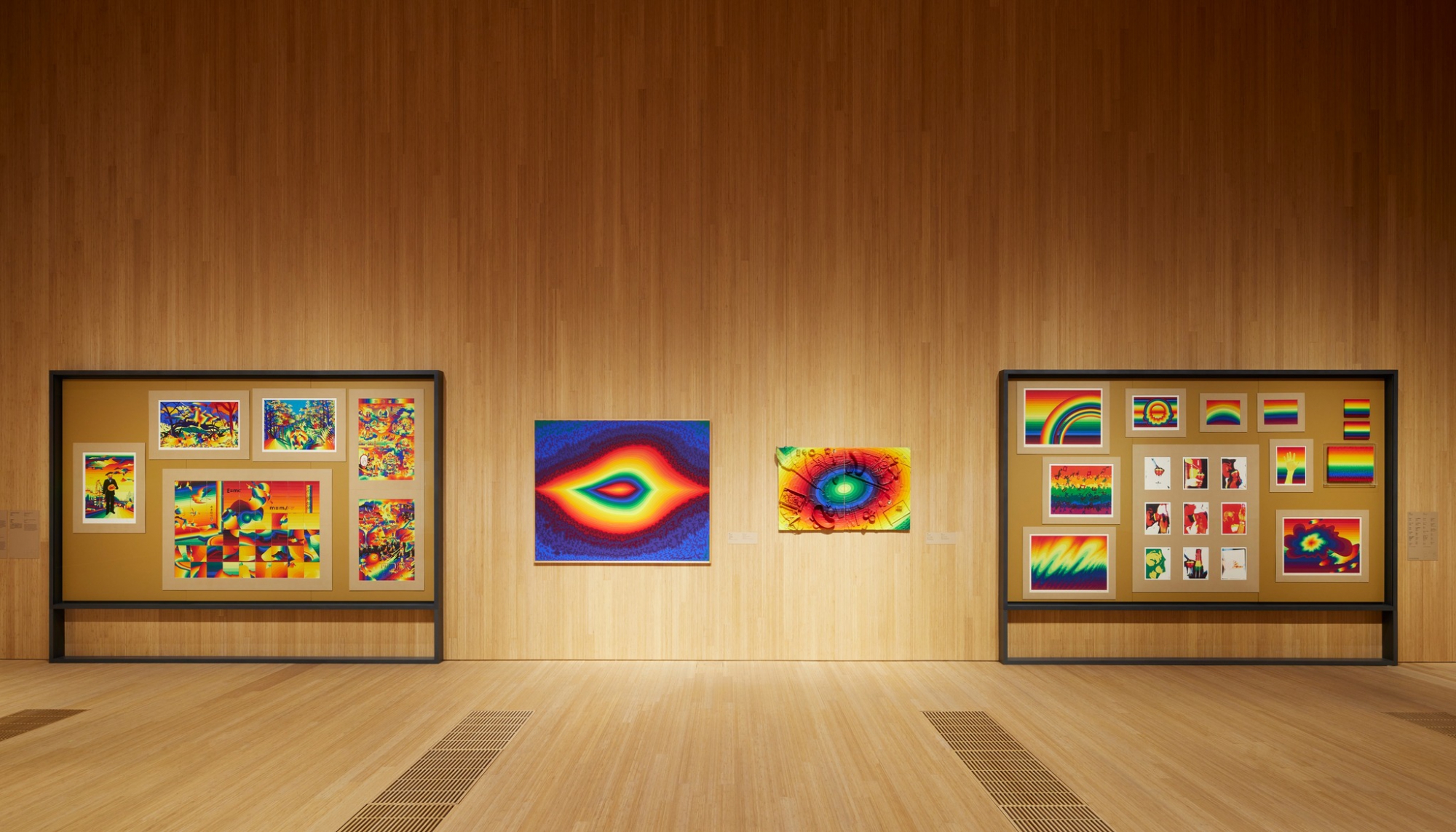 彩虹是靉嘔作品中的招牌圖案,體現他所抱持的普世信念。過去六十年來,他把這一圖案延展至畫布以外,創作出版畫、雕塑、裝置和環境藝術等作品。從本次展覽可見,靉嘔始終不渝的幽默感、好奇心和想像力,散發別樹一幟的藝術魅力。