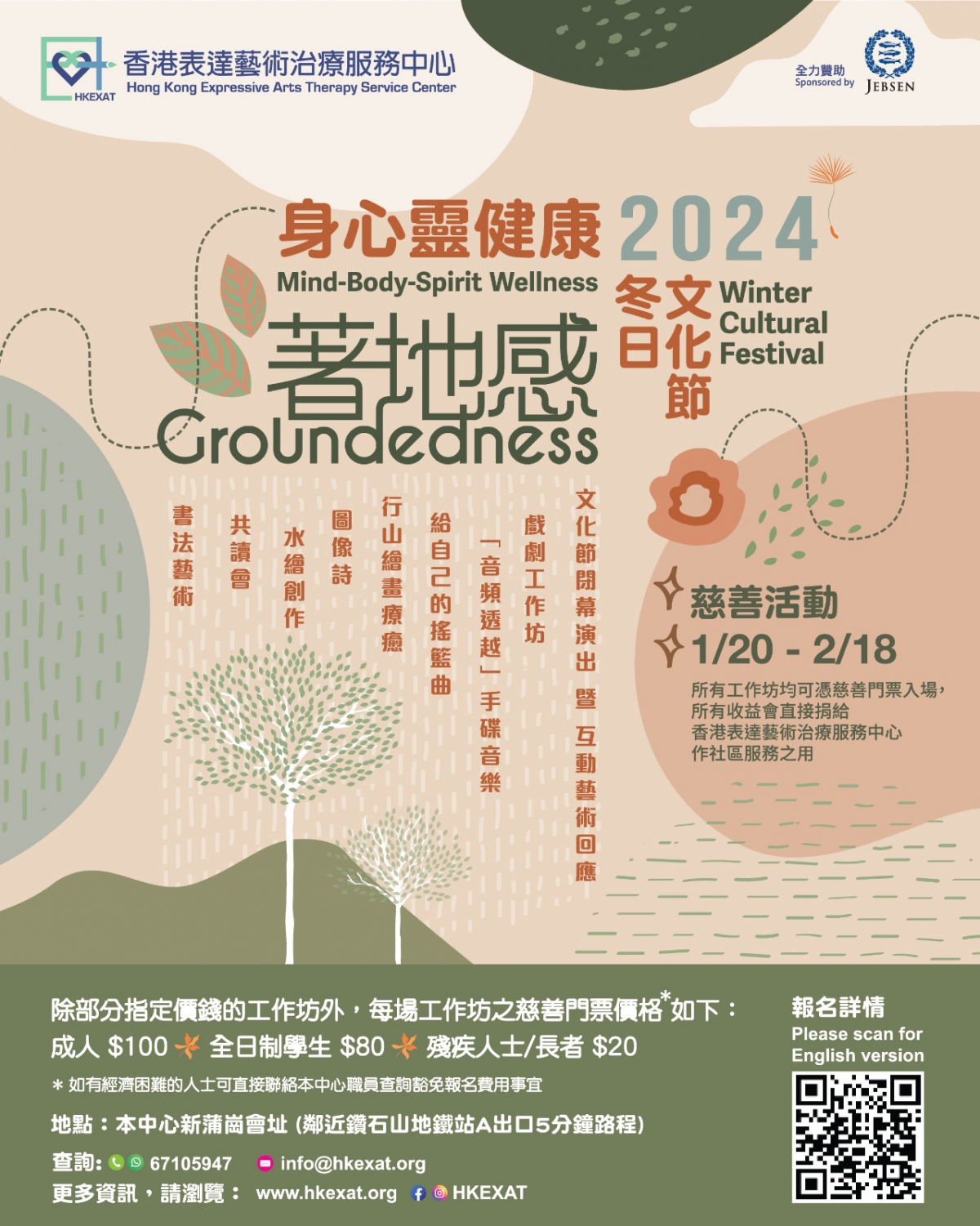 今個冬日,《身心靈健康冬日文化節》將以《Groundedness・著地感》為主題,透過藝術和創作連結身心靈,聆聽內在、隨心而行。相信藝術能帶引我們,在充滿紛擾和戰禍的世界環境中,穩住自身於當下,向內建立只屬於你,安全澄靜的立身之所。