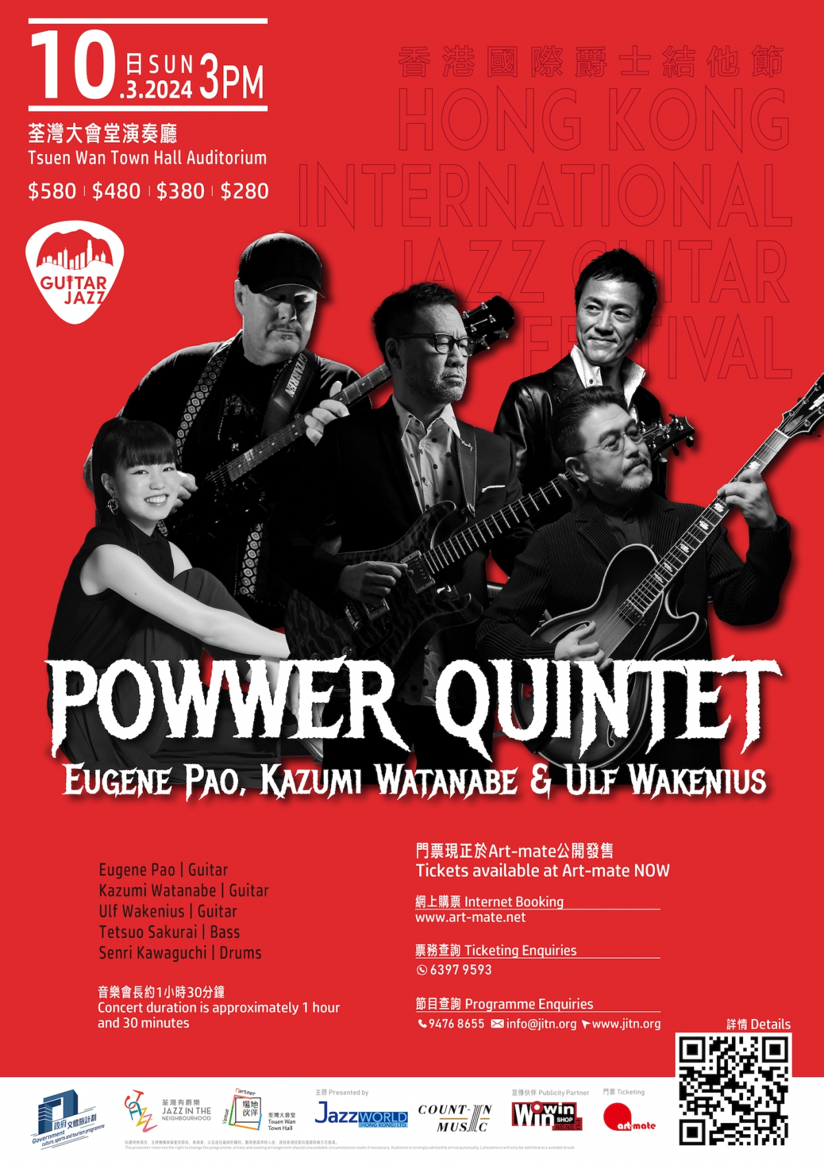POWWER QUINTET將開啟這三位結他傳奇的新篇章。他們放棄了一貫爵士結他三重奏的原音主流路線,而重拾他們的搖擺根源向融合爵士致敬!演奏這種高能量高難度的爵士搖滾樂,他們需要一個更出色的節奏組合,於是他們找來Casiopea 的低音結他手櫻井哲夫和人氣美少女重型鼓手川口千里特別合作,香港樂迷有幸可以目睹這一個爵士超級樂團的誕生!