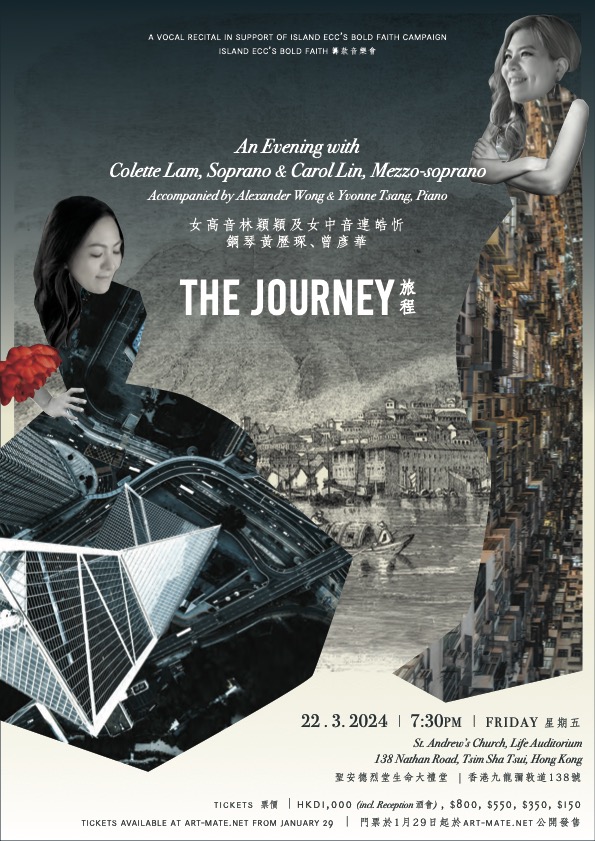Island ECC開展了Bold Faith 籌款活動以資助其北角建堂費用,為此香港 兩位優秀的歌劇及歌唱家林穎穎 ( Colette Lam )和連皓忻 ( Carol Lin ) 將演出一場別出心裁的聲樂音樂會。音樂會以 “旅程"為題,透過著名古典和現代詠嘆調及二重唱,探索信仰之旅。