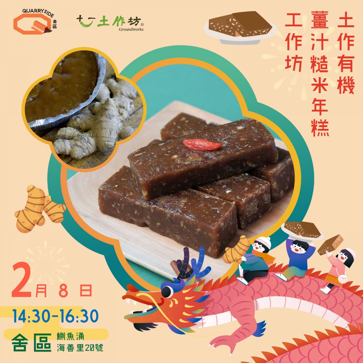 新春佳節,舍區繼續夥拍土作坊,舉辦有機薑汁糙米年糕工作坊,製作啖啖黏軟口感又特別有薑味的年榚。希望大家過節時,都一樣可以食得健康,過一個甜甜蜜蜜嘅新年!每名參加者可取得約600g年榚。
