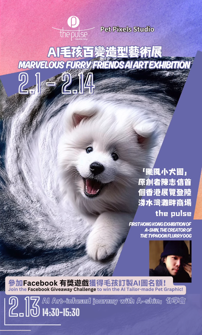 the pulse邀請到「颱風小犬圖」原創者—台灣著名藝術家陳志信 ( A-Shin )@coffee_time_corgi 於2月1日至14日舉辦全港首個「AI百變造型毛孩藝術展」,展出獨家為the pulse創作的三幅限定作品以及超過五十幅以配合AI技術精心創作的攪笑毛孩圖,當中不少得其標誌性作品「颱風小犬圖」。2月13日他更專程來到現場舉行分享會,大談日常創作心得,並帶來特別手信,通過the pulse送出毛孩訂製AI圖名額,實現大家天馬行空的願望!
